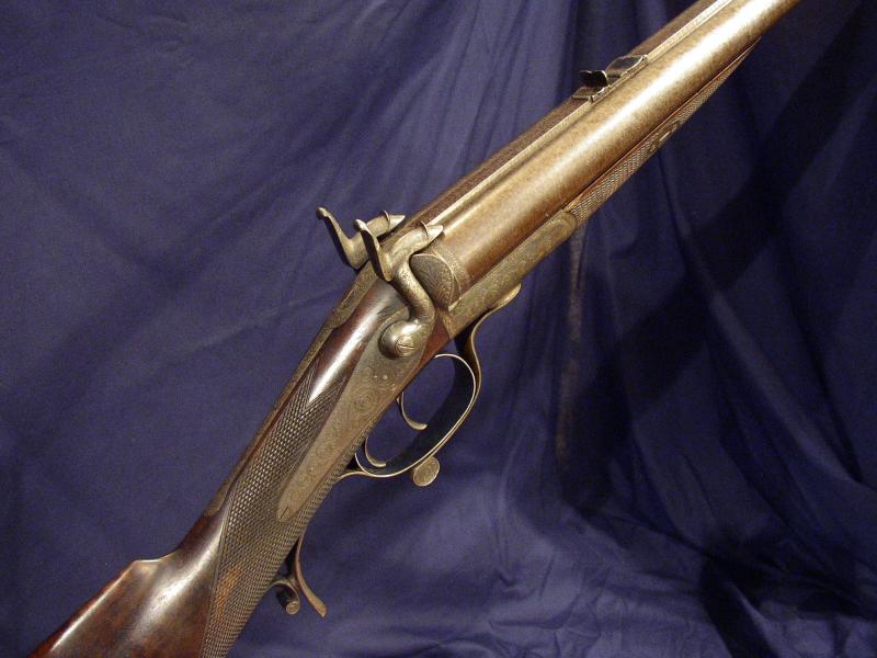 Pinfire Double Rifle. 30" bold damascus. 4 folding leaf sights, 50-200