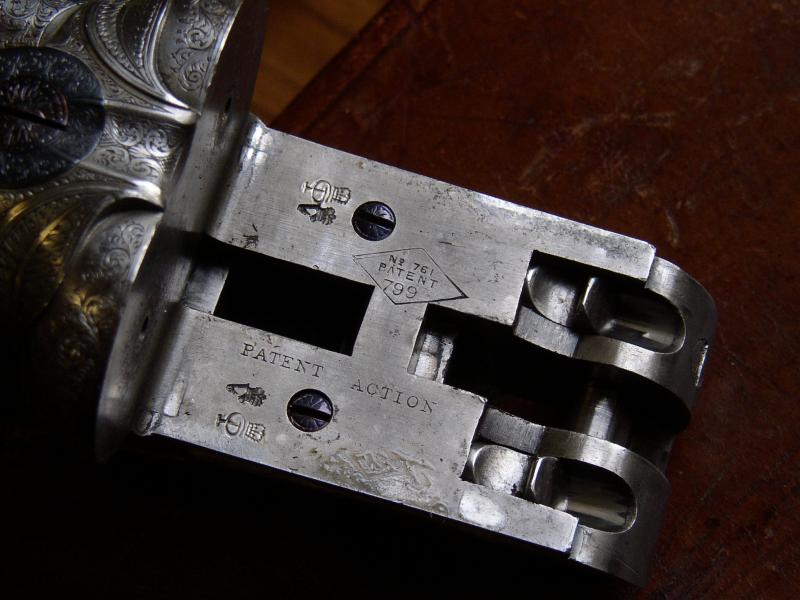 gun details and photos. The Gun Trade It should be understood by any student of the gun trade, mid 19th century to mid 20th century, that the trade was not organized quite as the public thought. With the exception of one or two of the most prestigious gun makers, guns were generally not 'made' by their vendors but by a host of small, highly skilled, anonymous gunmakers based principally in London and Birmingham. These largely unsung tradesmen could produce everything from a striker to a complete gun and supply the parts in any state from a rough forging to a fully finished gun complete with the vendors name and serial number. Furthermore, although some of the gun trade did specialize in a style or quality of gun, many could produce a product to any level of finish. The secret behind this fantastic level of flexibility was that most individuals specialised in one skill or another, be it barrel work, actioning, stocking, engraving or whatever, and the gun passed from tradesman to tradesman having the various procedures undertaken by a whole series of experts. The result was that virtually any gun in any bore, style and quality could be ordered within the trade. As I discuss below, this also means that you can find two almost identical guns that only really differ in the name engraved on the top rib and action. What says a lot about the quality of guns that were being supplied by the trade at the end of the 19th century are the prestigious names that turn up on them. Many pundits are pretty derogatory about the guns made within the Birmingham and provincial trade and it always makes me smile when they extol the virtues of guns such as Holland & Holland's Dominion back actions, which are arguable mainly of W C Scott origin! J Blanch and their position in the Trade. It has been said of J Blanch & Son that, although they undoubtedly sold elegant and finely finished guns, they were conservative in style and lacked the quest for innovation and progress that was apparent in other gunmakers of the time. Whether this is an accurate portrayal, depends on how you define conservative. If one was to define conservative as a tendency to stay with a tried and tested design and style and avoid technical embellishments, Blanch do fit the definition. However, if one was to define it as a willingness to conform with the mainstream of the gunmaking establishment then Blanch could be considered rather more radical. Looking